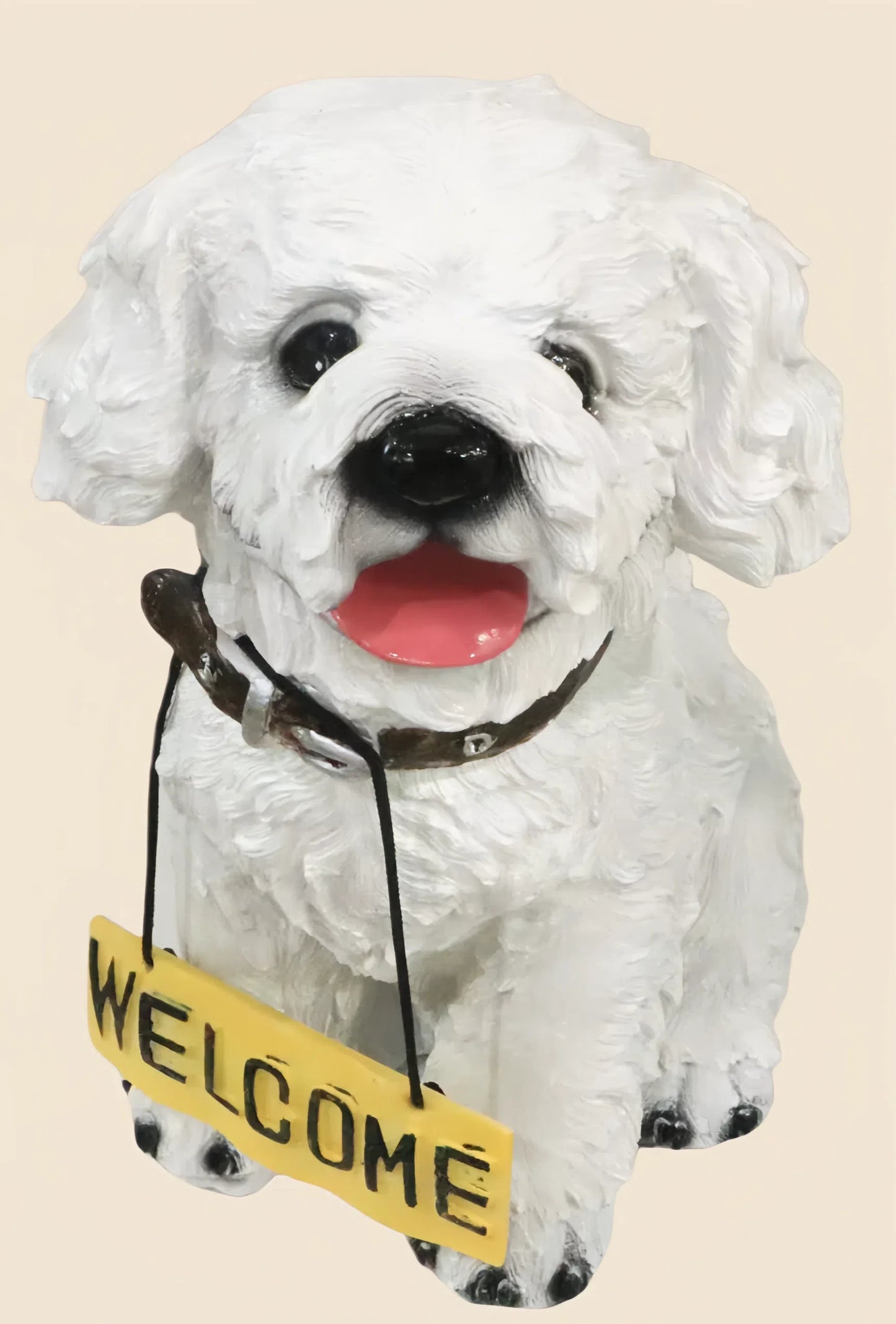 - Cheerful "WELCOME" sign hanging from the dog's collar